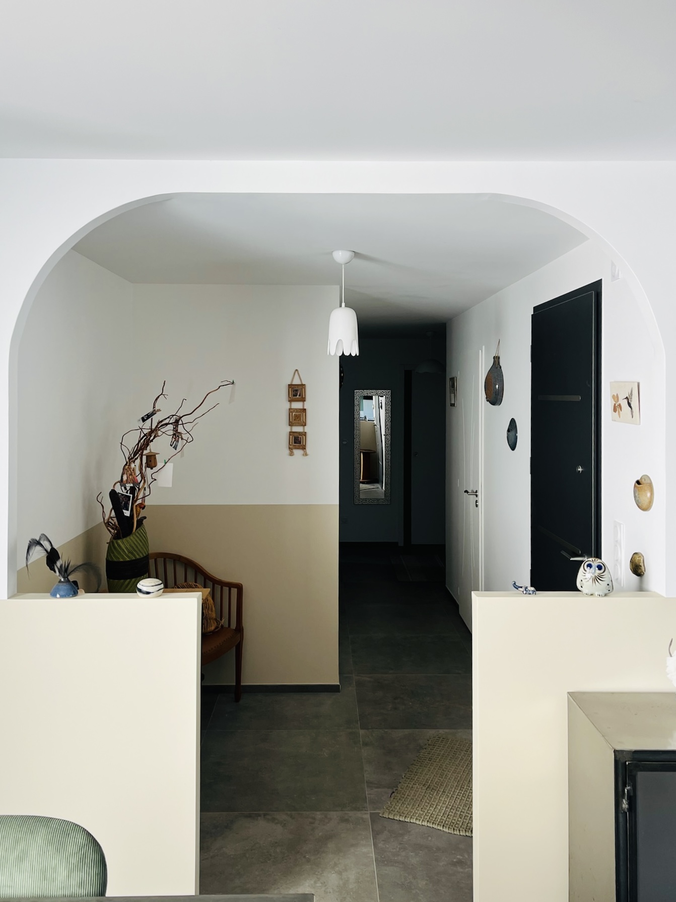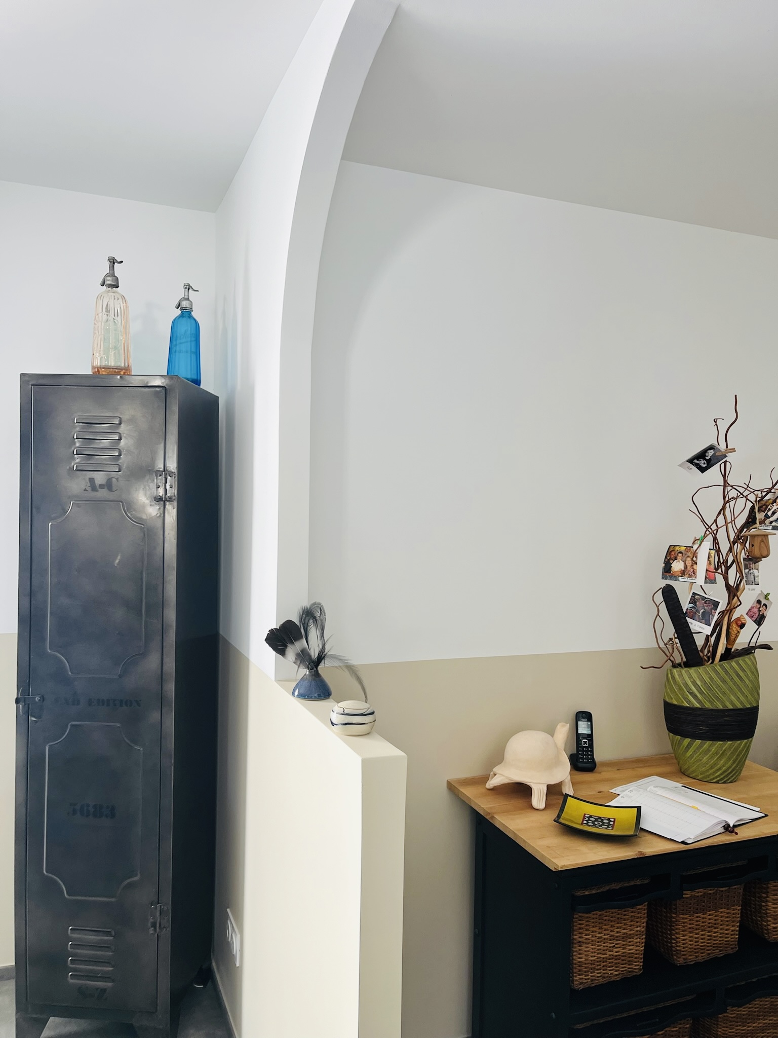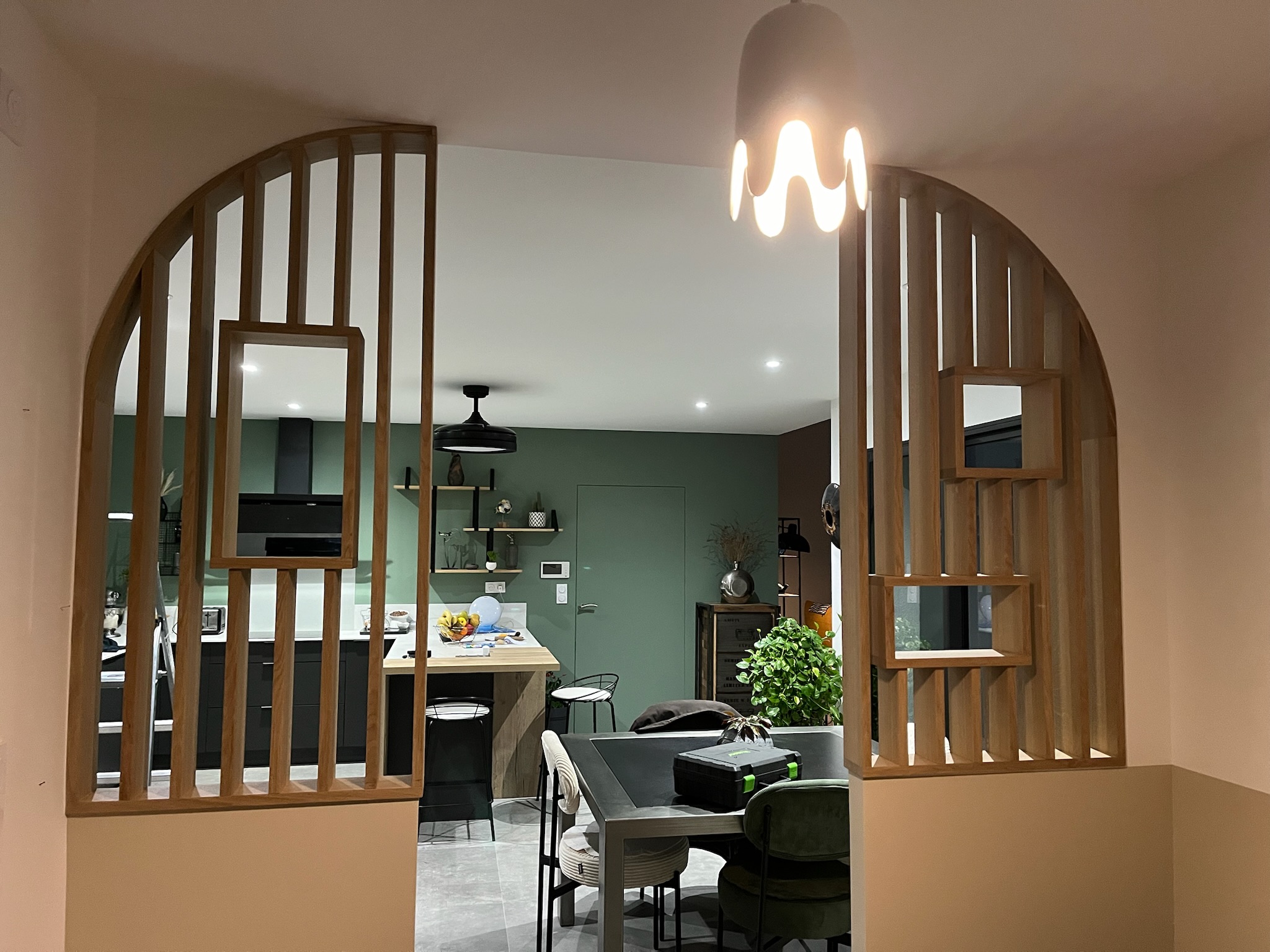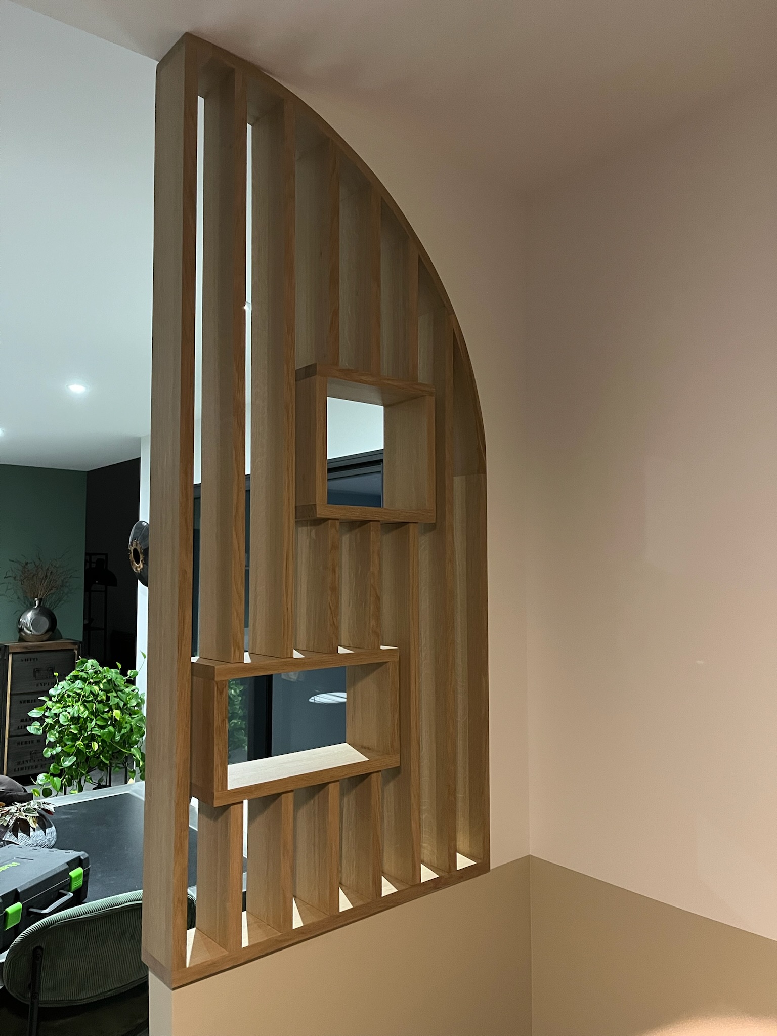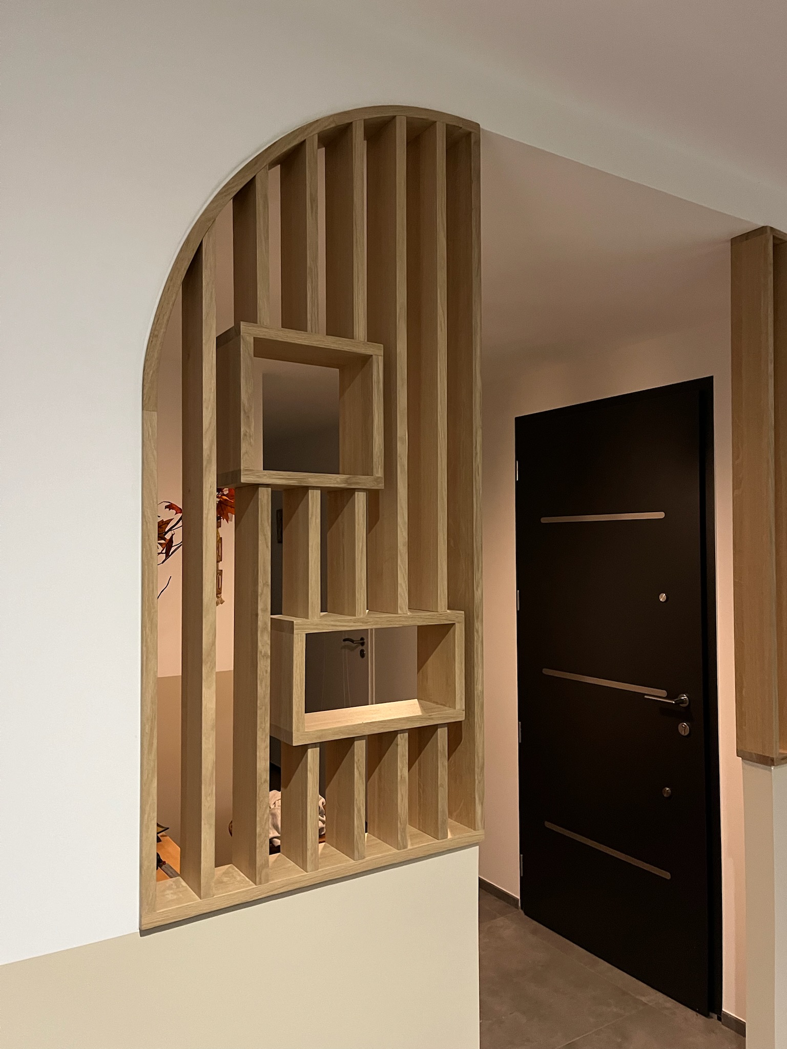 Cet ensemble de claustra sur-mesure, réalisé en chêne massif dans mon atelier de la région nantaise, encadre et défini une entrée. En effet, il crée une transition élégante tout en laissant circuler la lumière naturelle et le regard. J’ai dessiné ces cloisons sur-mesure pour épouser parfaitement l’arche existante et respecter l’architecture du lieu. Par ailleurs, les lignes verticales reprennent les courbes de la voûte et prolongent naturellement le mouvement architectural. Cette continuité visuelle permet d’unifier l’espace sans cloisonner de manière brutale ou imposer une séparation hermétique.