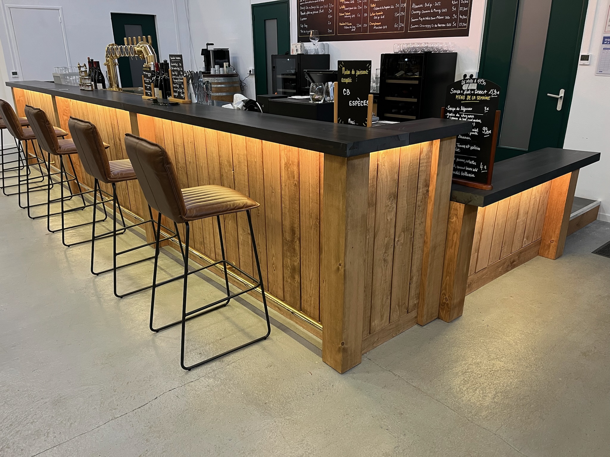 Par ailleurs, l’éclairage LED intégré met subtilement en valeur les reliefs du bois. Cette lumière douce crée une ambiance conviviale et accueillante pour la clientèle. En effet, elle souligne les veines naturelles et révèle toute la noblesse du matériau.